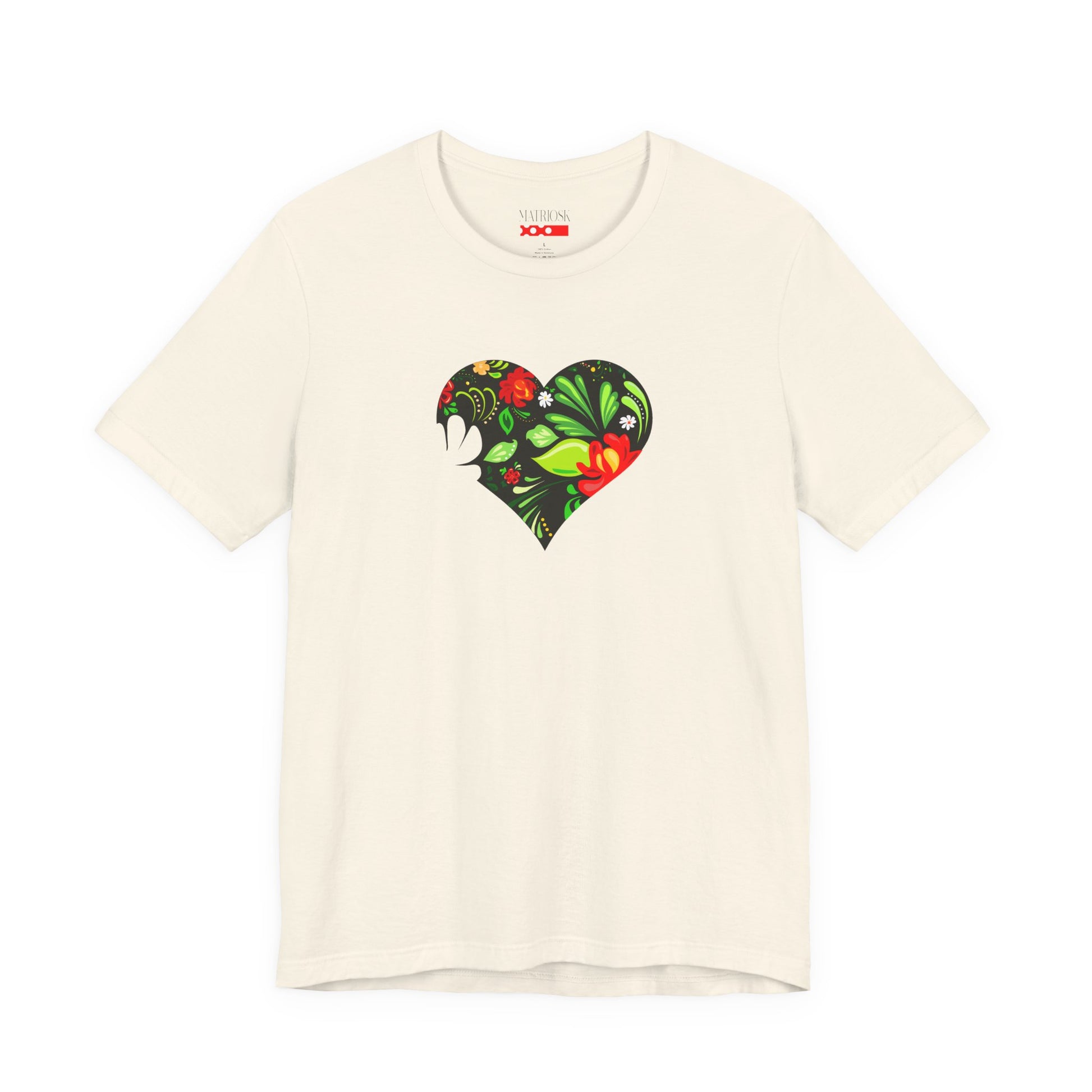 A lightweight, breathable cotton tee with a bold, hand-painted heart motif at center chest. The colorful floral pattern inside the heart brings a touch of folk-art warmth to a clean, everyday silhouette. Wear it when you want a subtle statement—layer under a denim jacket for market mornings or pair with linen shorts for sunlit walks. The soft crew neck and retail fit keep the look tidy while feeling lived-in and comfortable. It’s for people who appreciate handcrafted-inspired graphics and easy, wearable pieces that carry a little story.