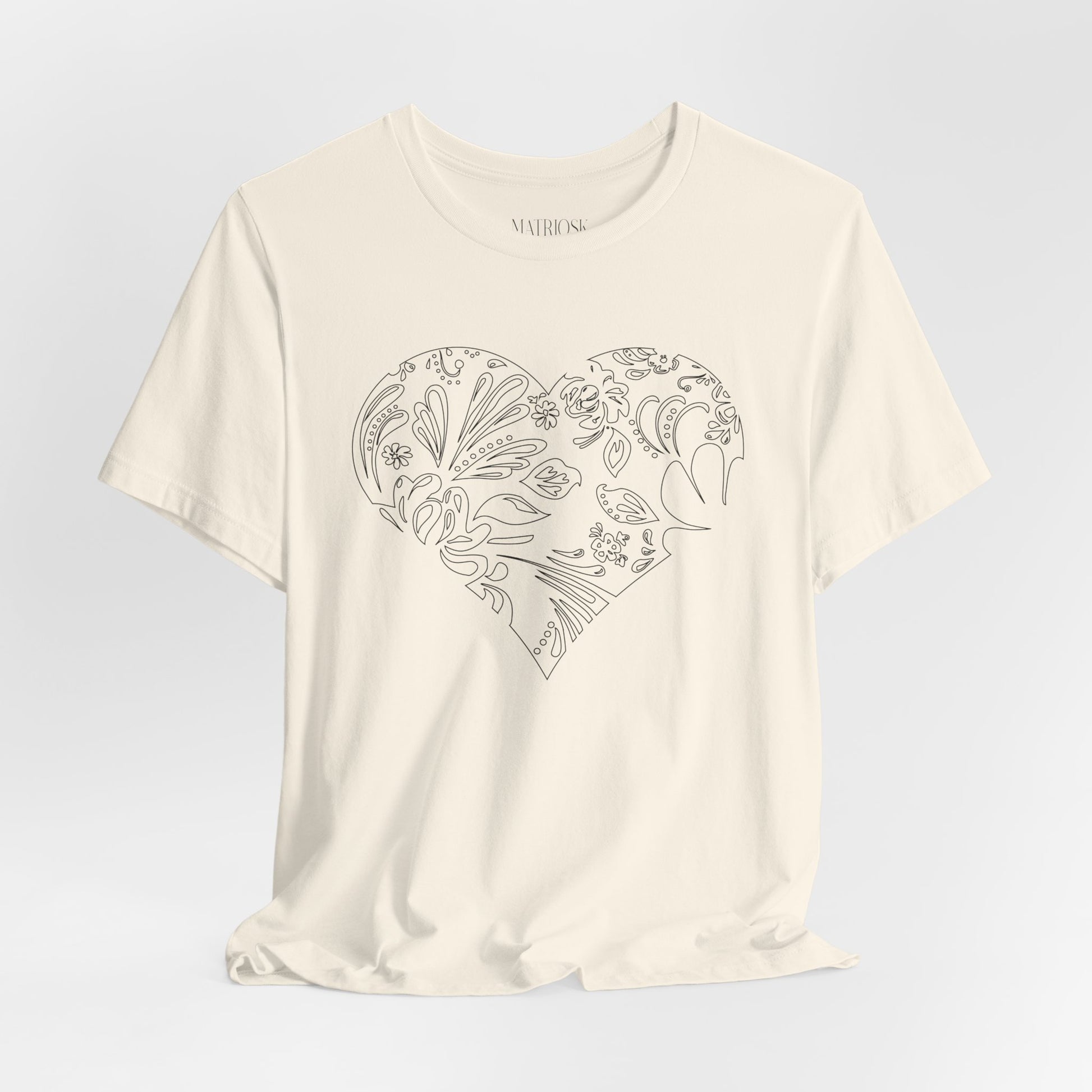Soft, breathable, and thoughtfully made — this tee carries a hand-drawn floral heart across the chest, a quietly pretty statement for everyday wear. The lightweight Airlume combed and ring-spun cotton feels cool against the skin and layers easily under jackets or over long sleeves. Clean crew neckline and a retail fit keep the silhouette neat without feeling tight. Small details like side seams, shoulder tape, and a ribbed knit collar mean it holds its shape wash after wash. The subtle floral heart reads delicate up close and organic from a distance — wear it on slow mornings, neighborhood strolls, or when you want a gentle reminder of what matters most.